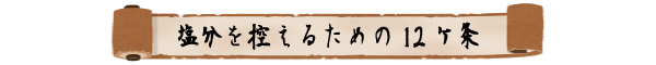 塩分を多く摂っている人ほど血圧が高い傾向があるようです。それは塩分を摂りすぎると、塩分濃度を薄めようと身体が血液中の水分量を増やそうとするためで、その結果、血管が膨らみ血圧が上昇してしまうのです。1日の食塩摂取量は、高血圧の人の場合、6g未満が望ましいとされています。予防のためにも、厚生労働省などが推奨する「塩分を控えるための12ヵ条」を参考に、減塩に取り組んでみませんか。